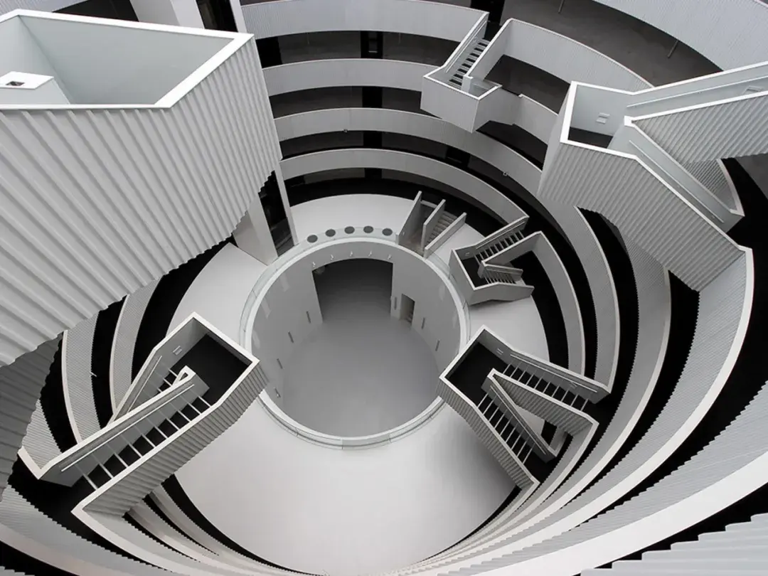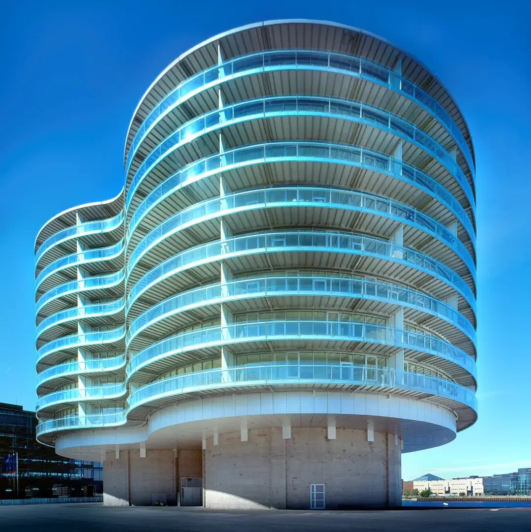 豆饼厂在1990年代关闭后,被重新开发为一处居住和办公的新区,双筒仓原是工厂的一部分,为高42米、宽25米的混凝土筒体。MVRDV将筒仓整体改造成为一座拥有 84 间居住单元的综合公寓,用通过条状的阳台覆盖立面,将两个筒仓合并为连续的、波浪状立面的单体,建筑内部的空芯用于建筑、楼梯、电梯和走廊等基础设施功能,探索了工业遗存的居住化改造的方向。