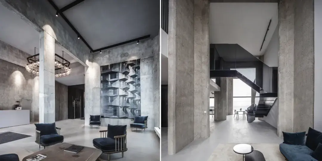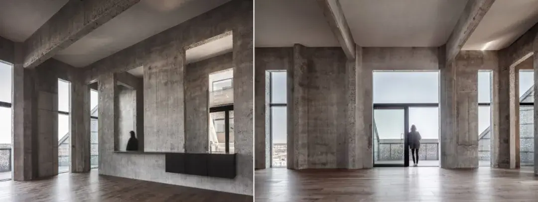 客房内部,留有裸露的水泥梁柱 ©Yilong Zhao