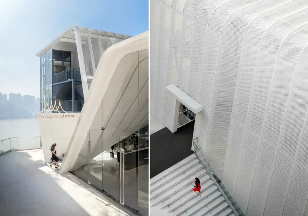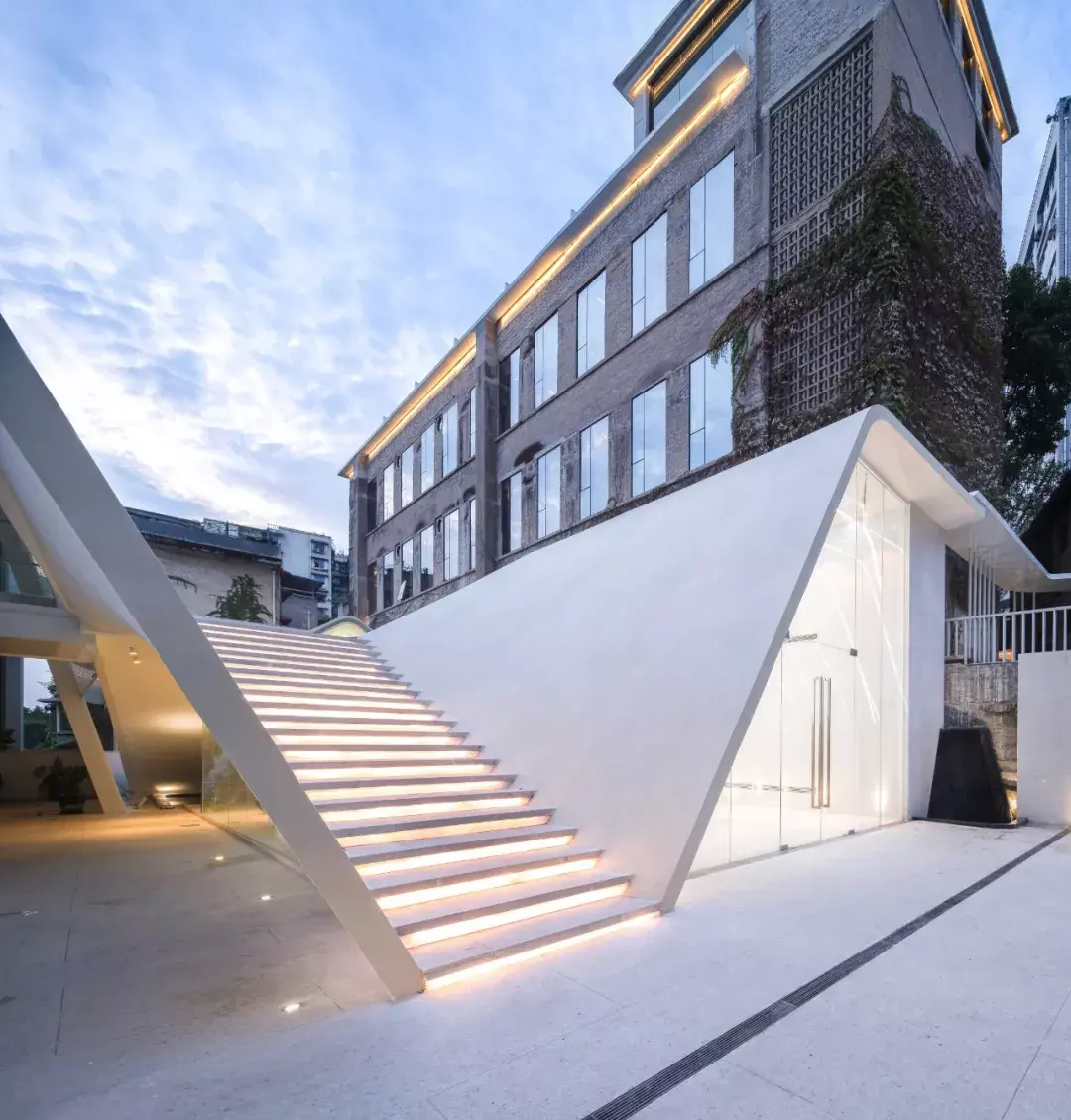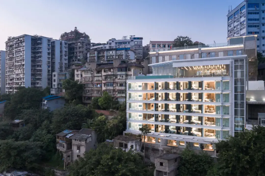 项目位于重庆市渝中区枇杷山印刷一厂,建筑原为厂房及宿舍,依山就势坐落于坡地之上。设计团队对老厂房更新既有创造性改变,也小心谨慎地保留了历史记忆。新建部分采用薄壳结构与金属幕墙构成的“裙摆”如同画布,白净轻盈;与粗粒的老墙面或裸露的水泥梁柱相互对比烘托。身处酒店中,既能感知改造后的当代美学,也能回忆起老厂房作为工业遗存的历史美学。
