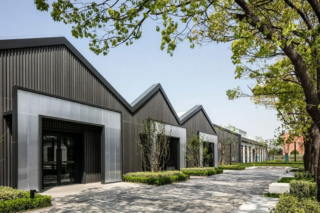 园区前身为黄二村工业园,经过30年的使用,其建筑风貌及设施陈旧,产业低效,整体与上海南部科创中心核心区定位不相匹配。通过“区、镇、村、社会资本”四级联动模式,园区实现了存量资产盘活,产业的转型升级,改造提升后的淡水河畔产业园成为轻型生产、研发、办公功能混合的新型产业园区,成为上海西南部的科技创新中心的重要组成部分。新园区分东西两区,共46栋建筑,设计团队在保留了原有建筑外立面和屋顶等要素的基础上,对其功能进行升级,以实现外观、功能和实用性的三方结合,也为同类型的老旧厂区提供了可借鉴的宝贵经验。