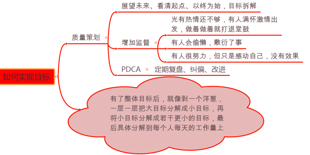 通过PDCA的方法,围绕质量目标这一中心,质量策划+质量控制+质量保证+质量改进的方法达到目标,重点是质量策划