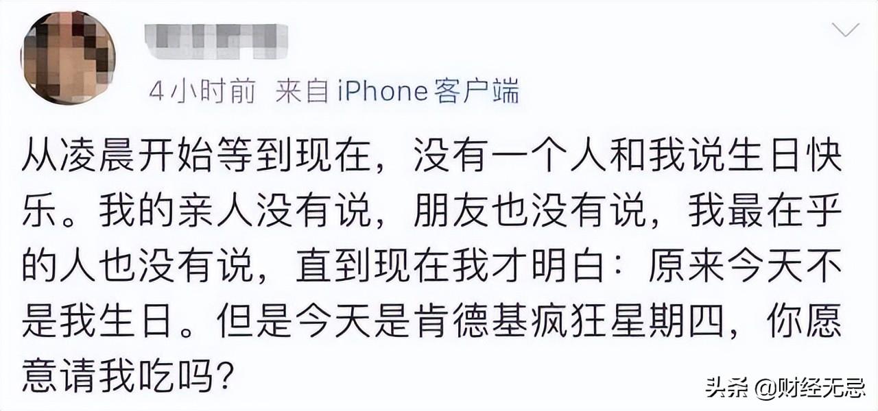 作为销售端的促销活动,“疯狂星期四”的本意是让利促销,结果阴差阳错之下,成为了时下最热的“互联网新潮”,一些想吃肯德基的朋友们在星期四发布一些魔幻且离谱的文案,并无一例外在结尾表达想让别人请自己吃肯德基的愿望,被广大网友称为“疯狂星期四文学”,又催生了一个新的族群“肯德基文学家”。