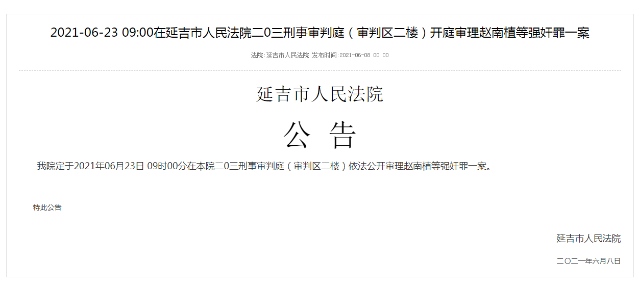 延吉市人民法院司法公开网开庭公告显示,赵南植等强奸罪一案于2021年6月23日上午9时在法院二0三刑事审判庭开庭审理。