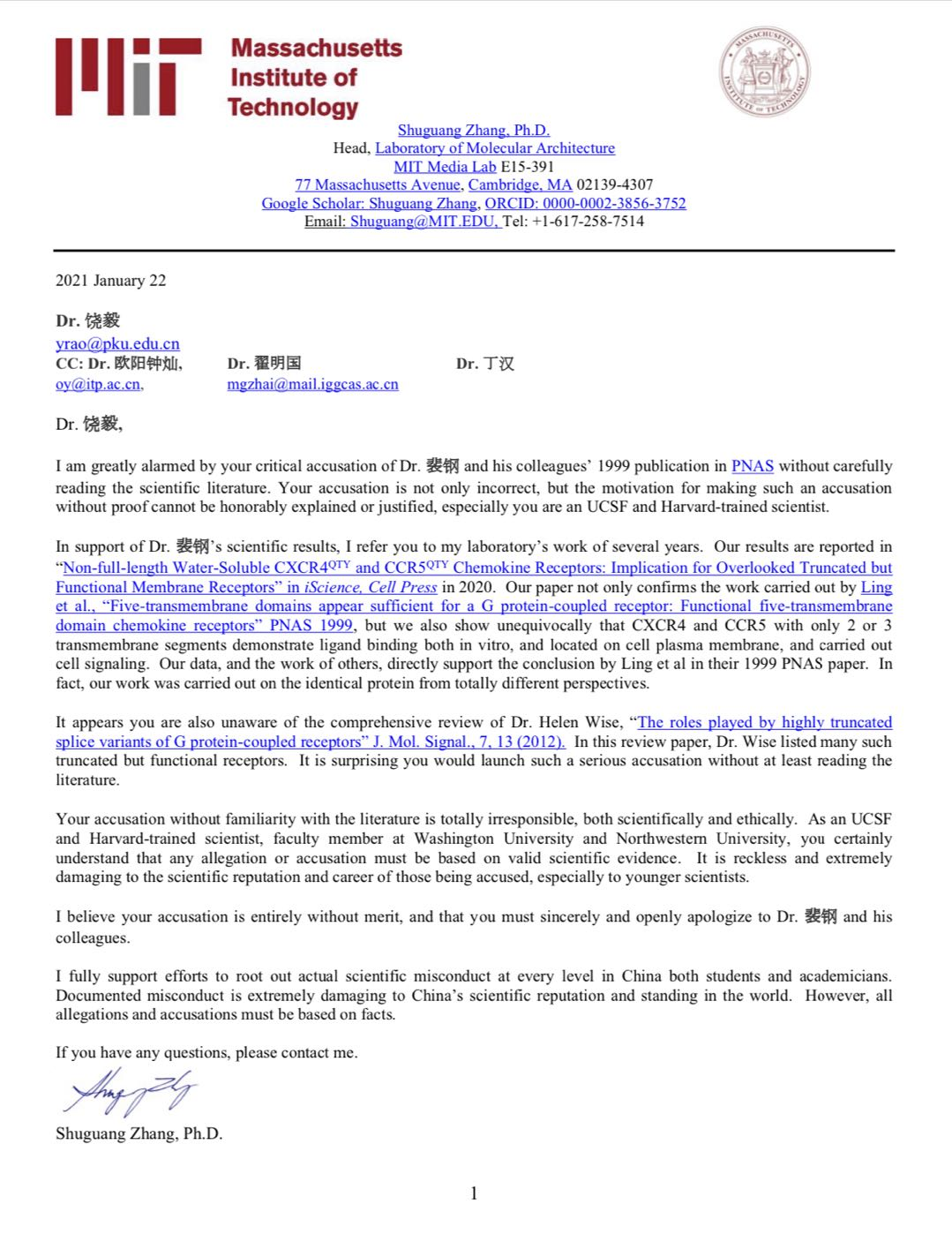 1月22日,美国麻省理工学院分子结构实验室(Laboratory of Molecular Architecture)首席研究员(Head)张曙光向科学网提供了一份当天致饶毅教授的信件,就后者21日晚在其个人公号“饶议科学”上“正式举报林-裴(1999)论文涉嫌学术不端”一文发表看法。
