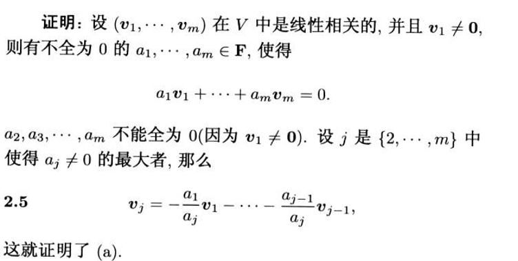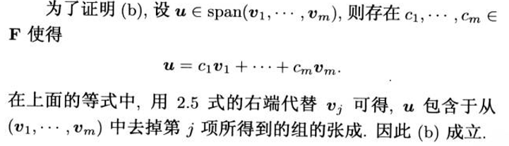 我们得到这个引理有什么用呢?实际上就是,一组线性相关的向量,如果第一个向量非零,那么必有向量包含于之前的向量的张成,也就是说,可以由之前的向量表示,去掉这种向量,不会改变剩下的向量仍然可以张成为向量空间的这样一种事实。