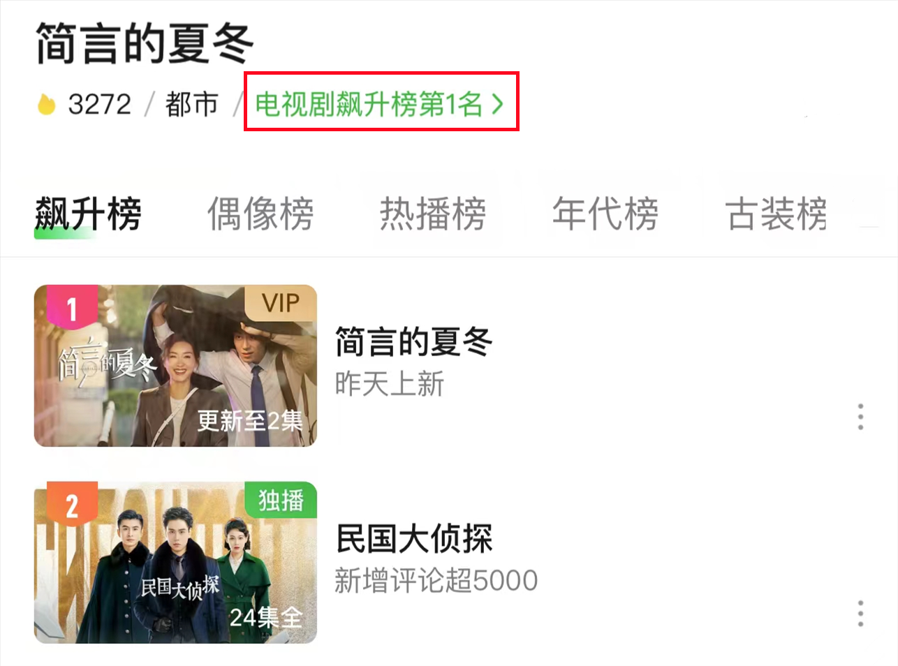目前《简言的夏冬》两集,收视飙升榜单第一,皮哥确信这剧可以接着刷下去,而且很有可能,它会创造中国职场剧的一个标杆,有剧王潜质。