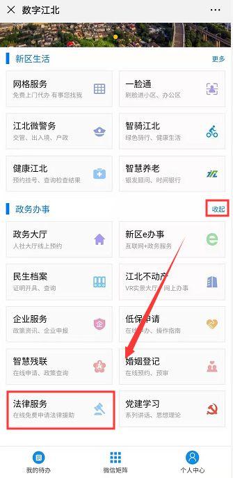 在“政务办事”一栏点击“更多”,找到“法律服务”