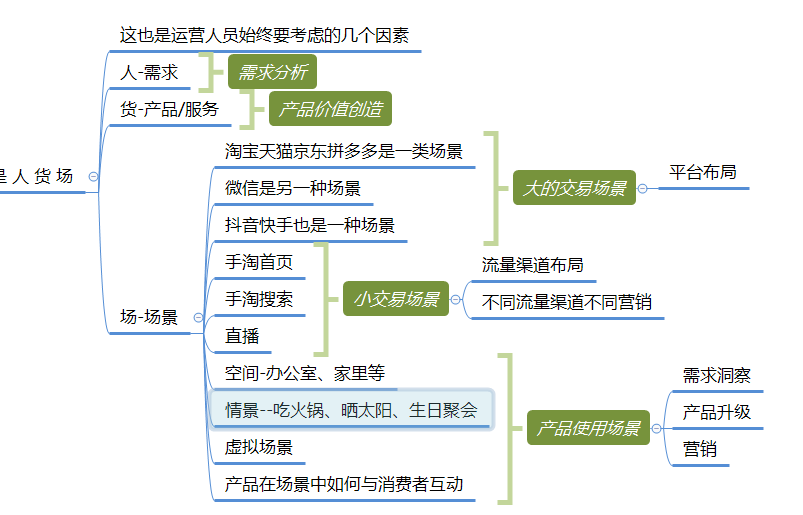 所以运营的主要能力和工作要围绕需求分析(人)、产品价值(货)、场景连接成交(场)。