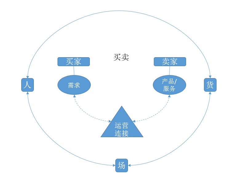 买家和卖家,买家有需求(人),卖家有产品(货)。在某个场景里彼此交换价值(场)。