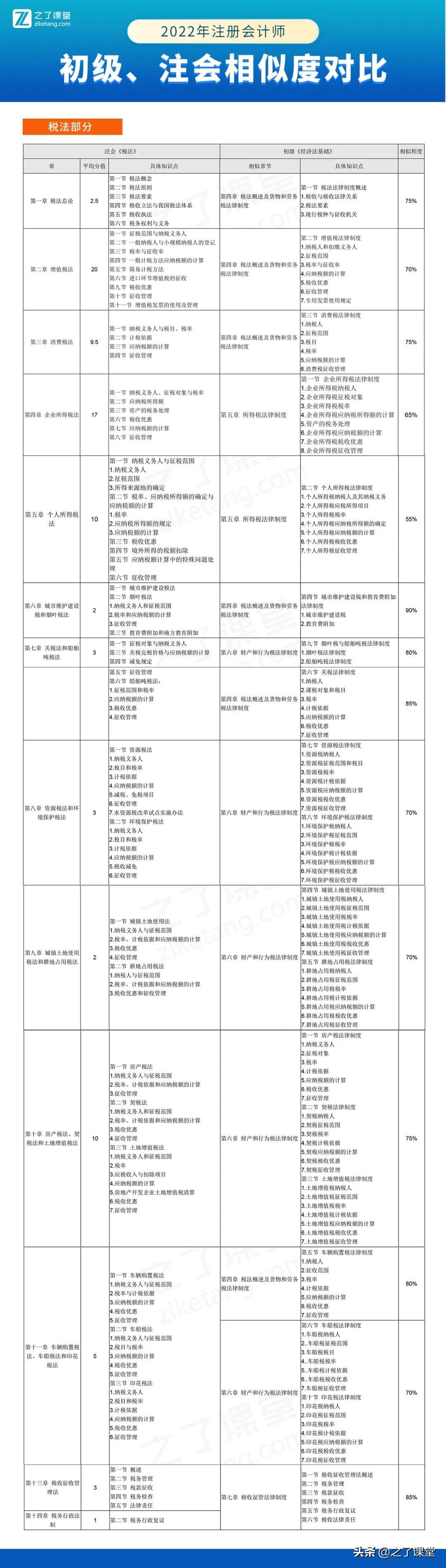 认真备考初级的同学,基础知识往往都比较扎实,这个时候再学习注册会计师内容远比以后重新学习要轻松得多。初级和注册会计师重合的知识点内容较多,建议大家保存图片后,放大查看。以税法部分为例: