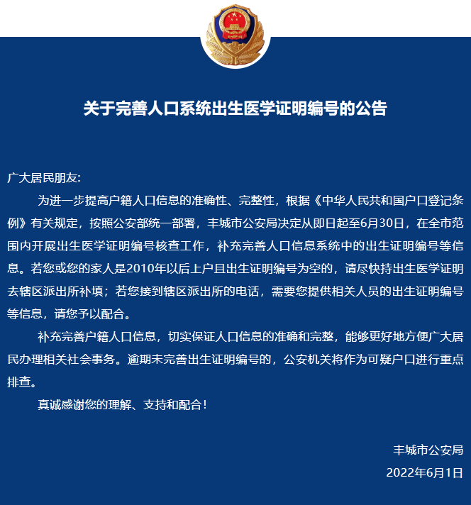 为进一步提高户籍人口信息的准确性、完整性,根据《中华人民共和国户口登记条例》有关规定,按照公安部统一部署,丰城市公安局决定从即日起至6月30日,在全市范围内开展出生医学证明编号核查工作,补充完善人口信息系统中的出生证明编号等信息。若您或您的家人是2010年以后上户且出生证明编号为空的,请尽快持出生医学证明去辖区派出所补填;若您接到辖区派出所的电话,需要您提供相关人员的出生证明编号等信息,请您予以配合。