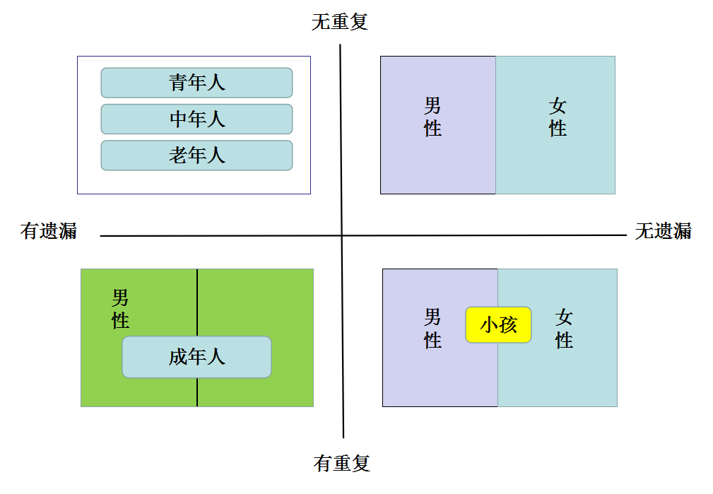 无重复、无遗漏的分类方法有很多种,我们主要介绍以下4种: