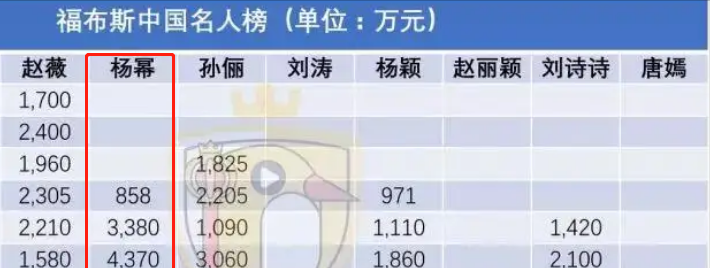 随着《小时代》《古剑奇谭》的爆火,2013年杨幂也登上了福布斯中国名人榜,年收入达到了五千万元。