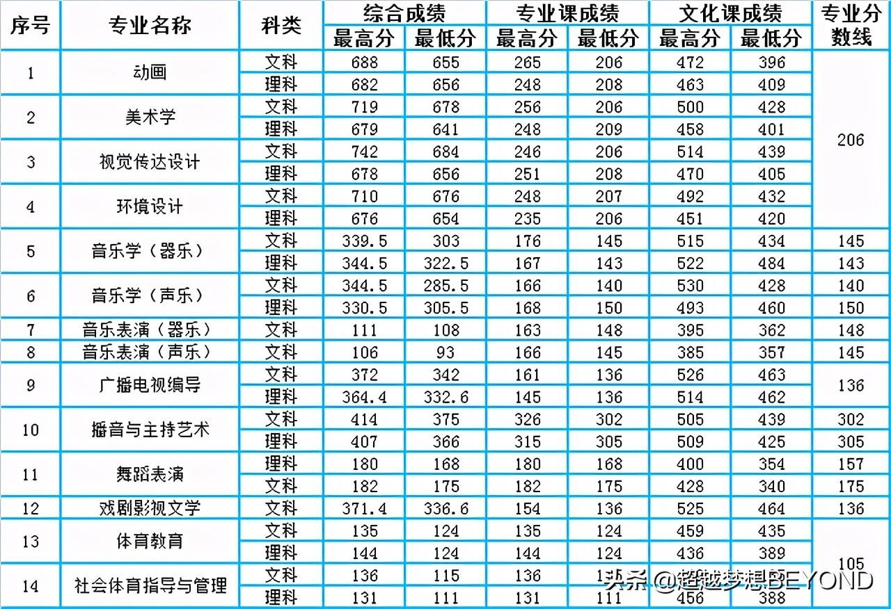 艺术体育类各专业文理科录取的综合成绩、专业课成绩和文化课成绩等信息统计情况,请看下表。