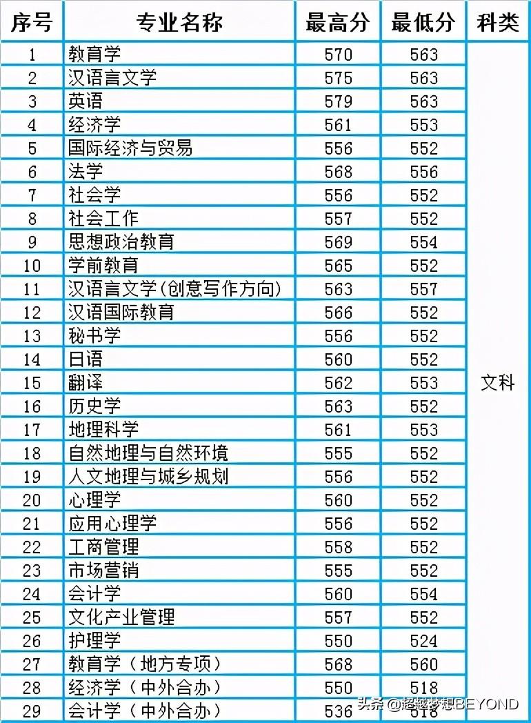 文科普通专业录取最高分579分(英语专业)、录取最低分552分;护理学专业录取最低分524分,中外合作办学专业录取最低分518分。文科各专业详细录取最高分、最低分统计情况,请看下表。