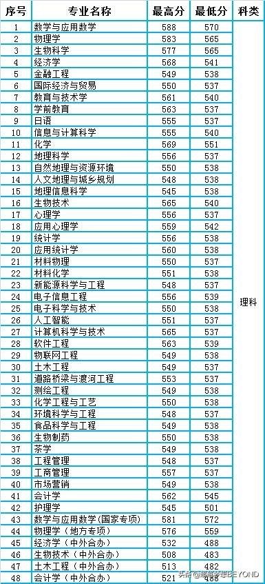 以普通类专业为例,理科录取最高分588分(数学与应用数学专业),录取最低分537分。其他类型专业的录取情况不再详述,考生们可以自行查看下表。