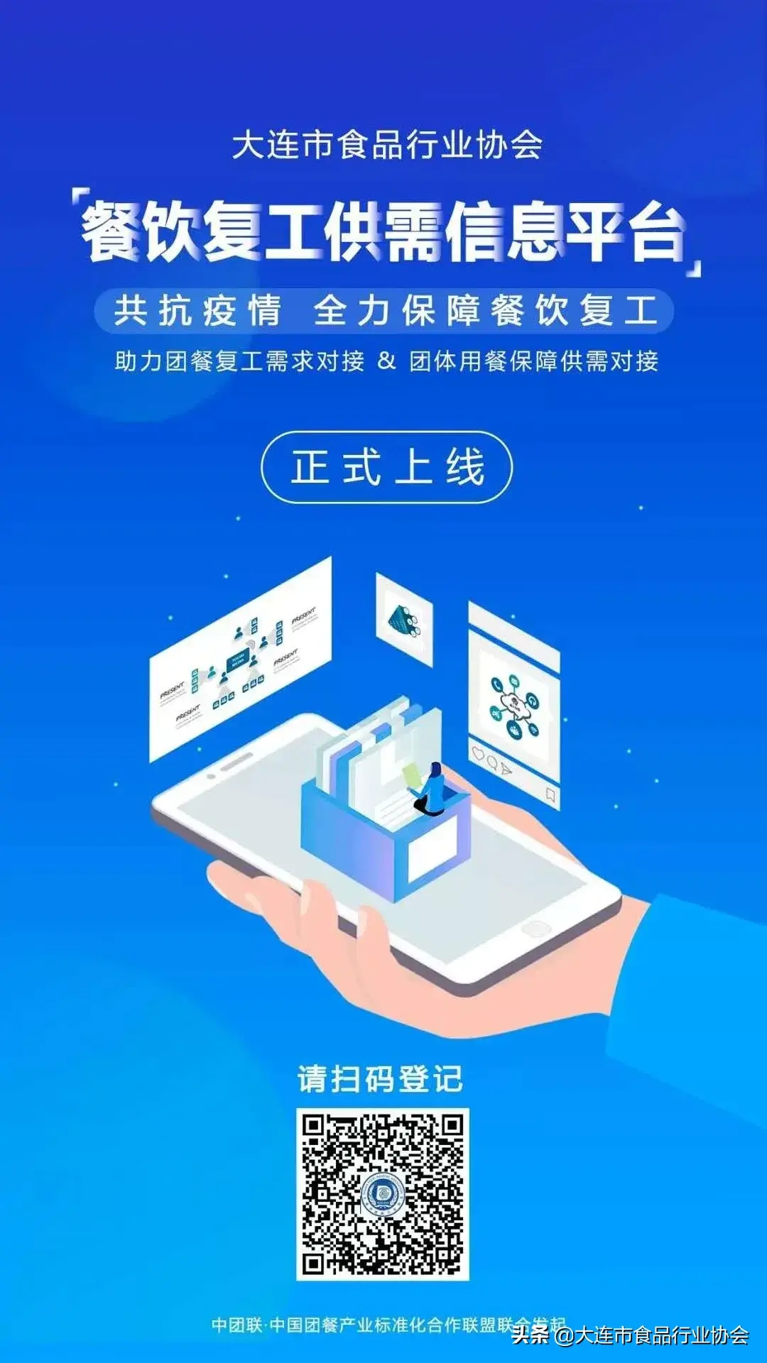 餐饮复工供需信息平台是由大连市食品行业协会、广东省团餐配送行业协会、安徽省团餐配送行业协会、辽宁省餐饮烹饪行业协会、中团联(中国团餐产业标准化合作联盟),在疫情期间联合发起上线。通过平台帮助协会企业、联盟企业共享真实有效的供需信息,助力团餐复工需求对接、团体用餐保障供需对接。平台目前面向连锁餐饮企业、团餐企业、中央厨房等企业单位,免费开放使用。