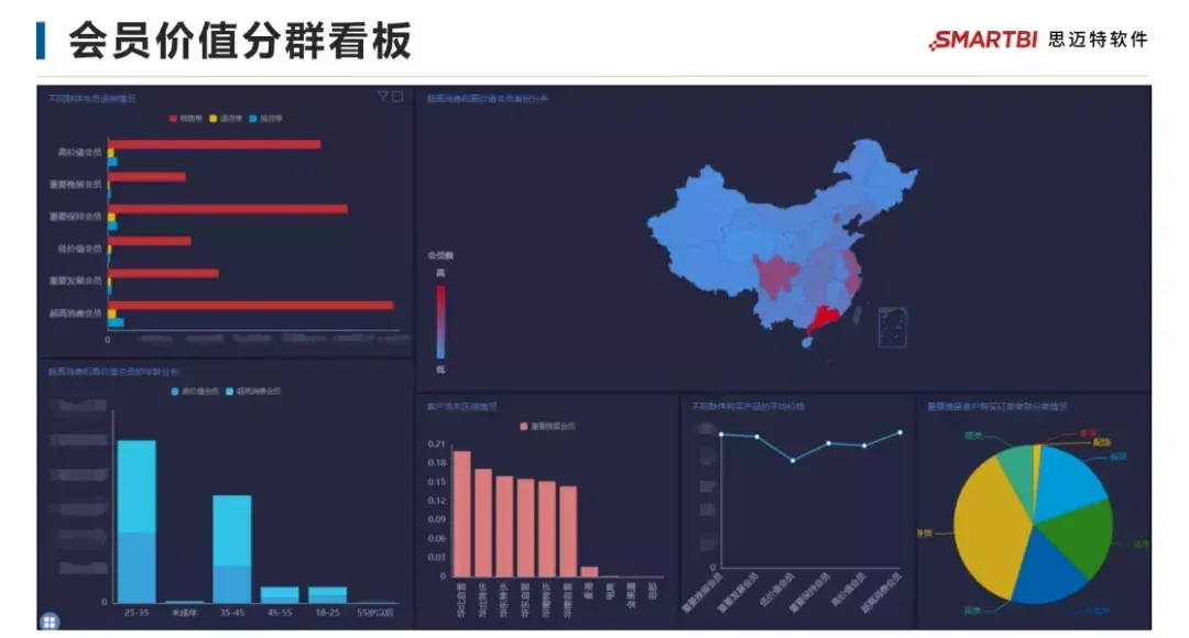 思迈特软件根据会员和销售订单等数据,通过AI技术建立合理的会员价值评估模型,对会员进行打标签、分析及比较不同会员群体的客户价值,并制定相应的营销策略,对不同的会员群提供智能的个性化服务,为衡量会员价值和会员创利能力提供重要的分析手段。