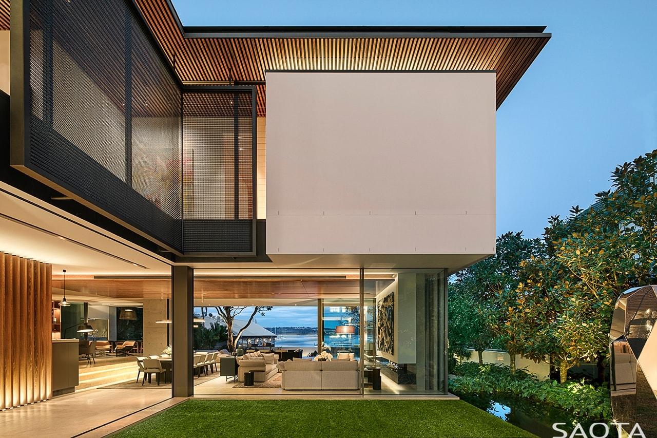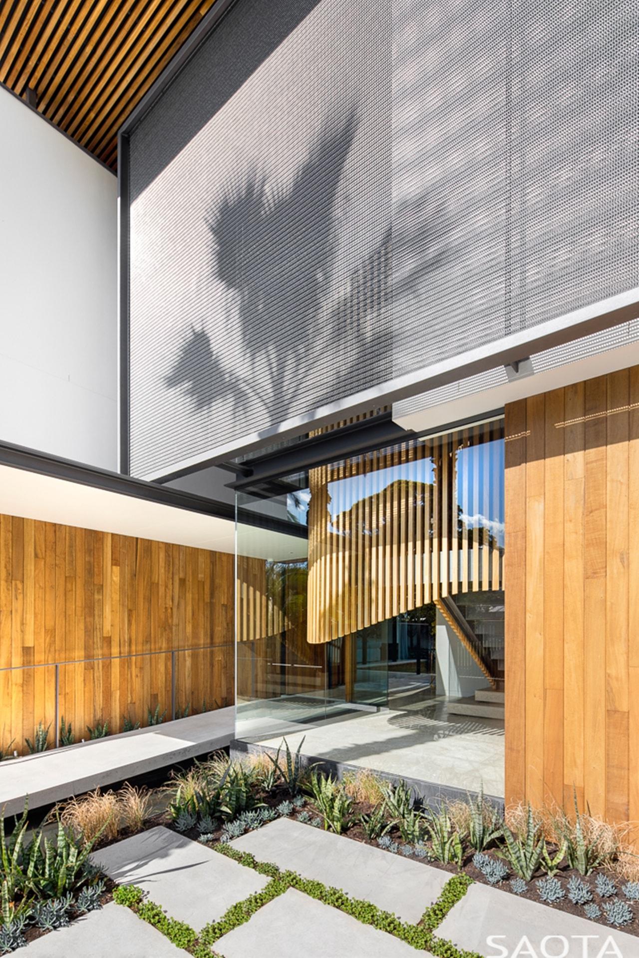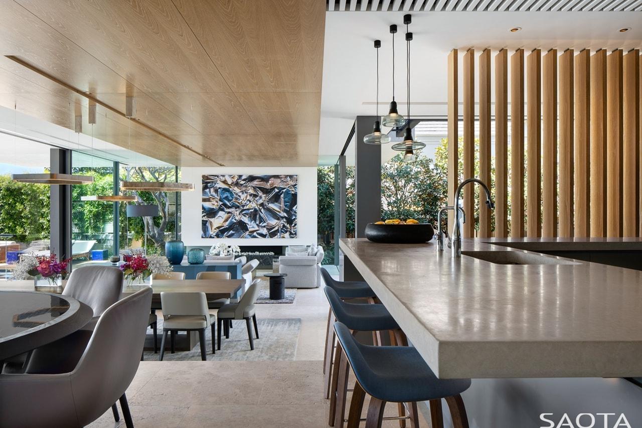 外墙玻璃墙与现代露台设计相结合时特别有用。移动玻璃墙系统可以完全打开室内生活空间,并将其与庭院和后院连接起来。SAOTA的建筑师使用这种"现代技巧"来创造一个令人惊叹的户外生活空间。此外,在后院的边缘设置了植物墙,以提供海滩的额外隐私,并从内部消除花园和海湾之间的区别。这在游泳池中得到了强调,其朝向和向水的延伸使两者之间有明确的联系。