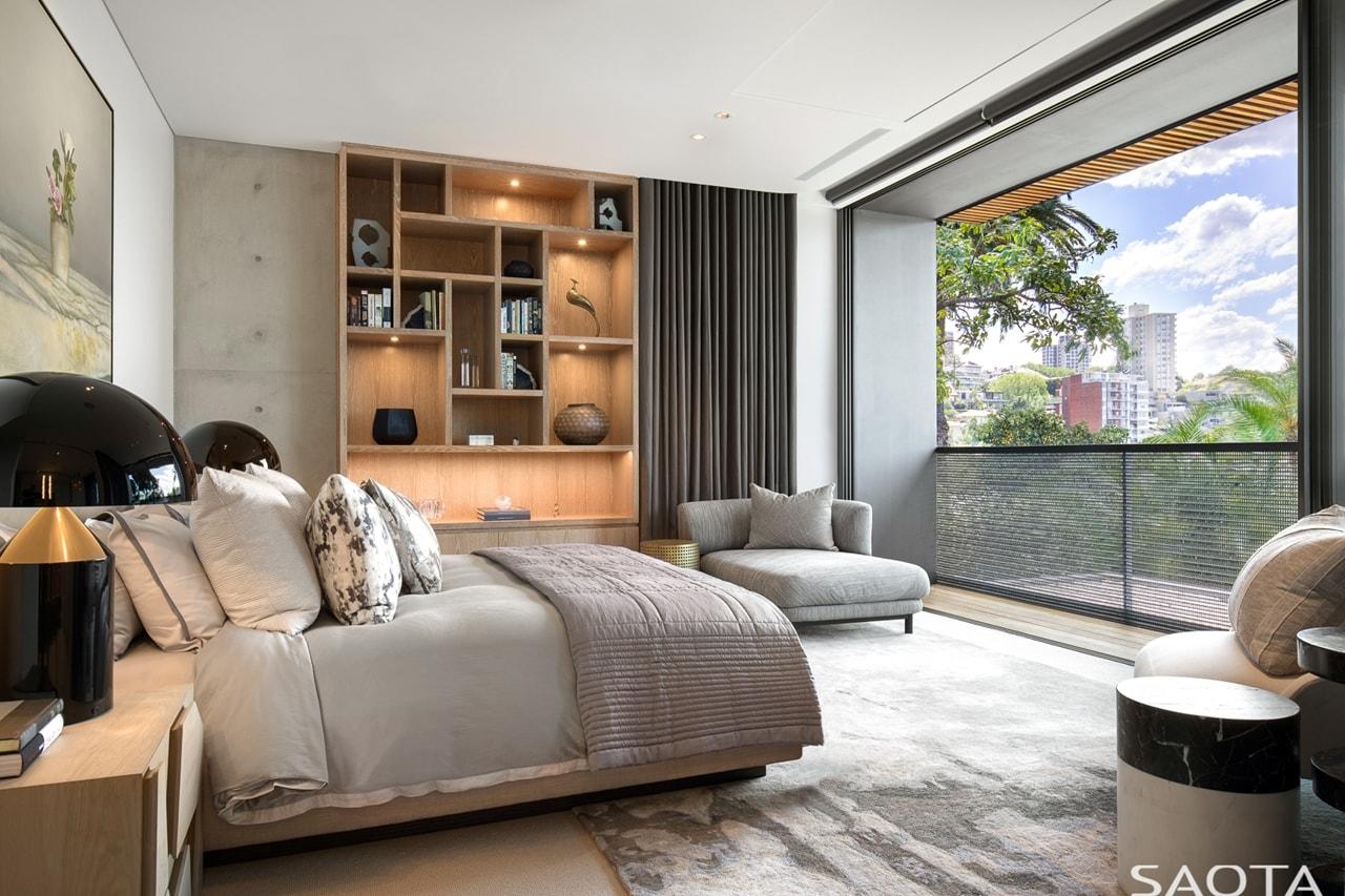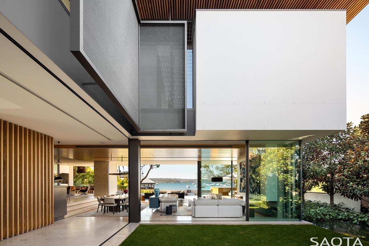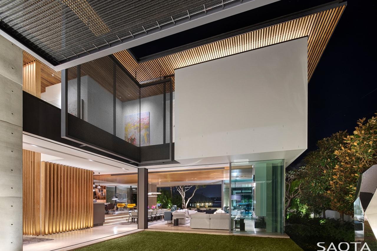外墙玻璃墙与现代露台设计相结合时特别有用。移动玻璃墙系统可以完全打开室内生活空间,并将其与庭院和后院连接起来。SAOTA的建筑师使用这种"现代技巧"来创造一个令人惊叹的户外生活空间。此外,在后院的边缘设置了植物墙,以提供海滩的额外隐私,并从内部消除花园和海湾之间的区别。这在游泳池中得到了强调,其朝向和向水的延伸使两者之间有明确的联系。