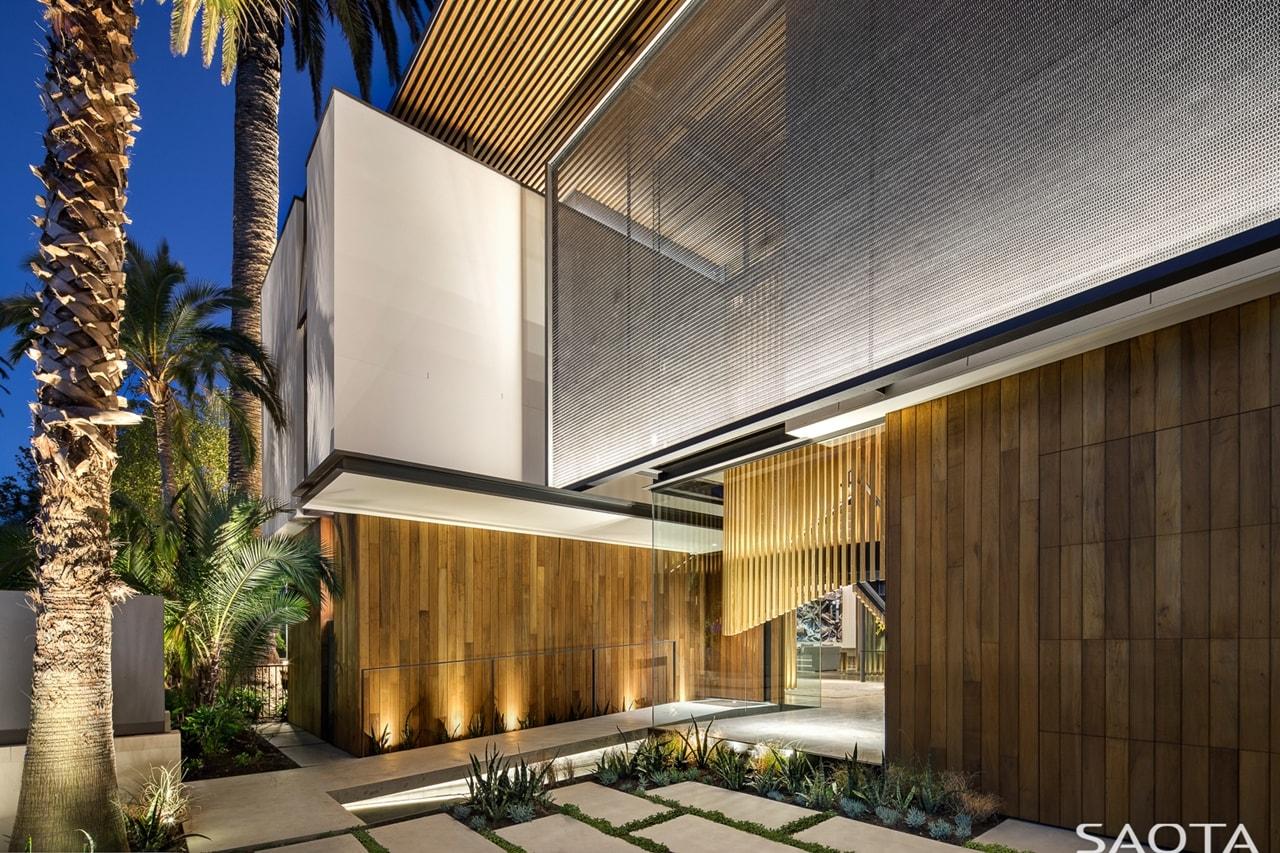 外墙照明完美地突出了每一个细节(甚至周围的棕榈树),高雅地照亮了房子,就像每一件艺术品一样。前立面设计的另一个有趣的特征是石墨灰色帆屏,这是新西兰为《指环王》电影开发的聚碳酸酯链条。"石墨灰色帆屏就在房子旁边,提供远离道路的隐私。同时也为房屋保留最佳的照明及景观。