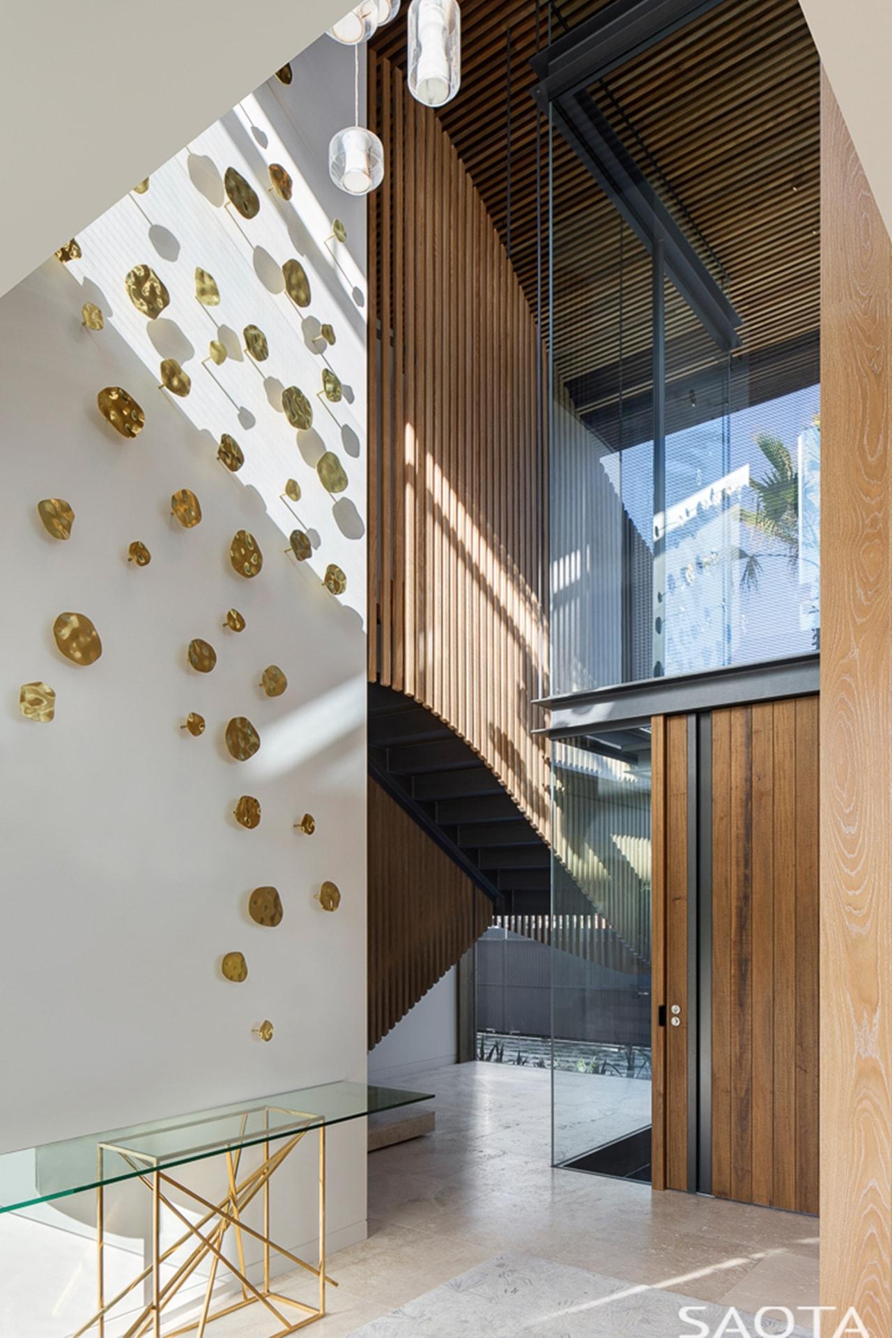 在房子内部,极具雕塑感的现代楼梯绝对是室内的视觉焦点。楼梯间的墙是由无框落地玻璃构成的,这样主人在进入入口时,这个极具创意的楼梯也被呈现在主人面前。楼梯设计是给客人留下深刻印象或使您的房屋真正独特的好机会,甚至可以增加其市场价值。在这种情况下,带有木制百叶窗的浮动钢制楼梯是房屋设计的完美补充。