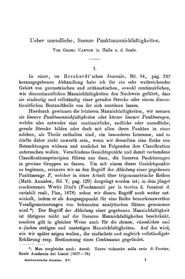 有些人认为,康托尔后来开创性的工作可以追溯到他最早的研究生论文。事实上,在康托尔致力于三角级数理论的研究中,我们确实可以发现他早期对“连续统”的兴趣的痕迹。在柏林的维尔斯特拉斯和黑尔的海涅的影响下,康托关于三角级数定理的第一篇论文于1870年3月完成并发表,旨在利用无穷三角级数,加深了对任意给定函数表示的收敛性的理解。从黎曼的三角级数和复变函数的工作出发,康托在文中证明了以下定理: