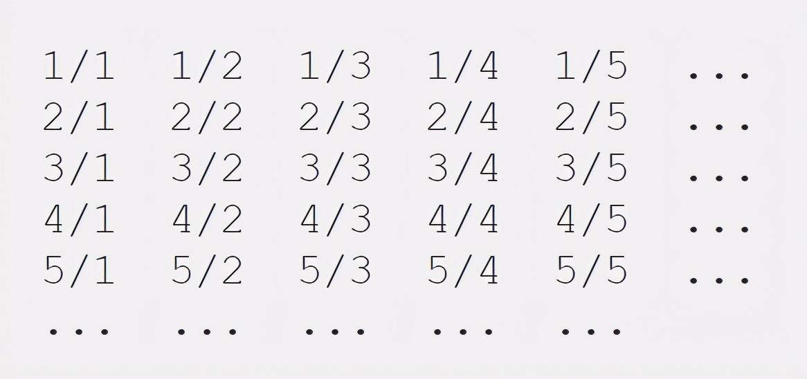 然后,从左上角开始,从左到右45度移动对角线,从1/1开始,然后是1/2和2/1,然后是3/1,2/2和1/3,以此类推。写下遇到的每一个新数。