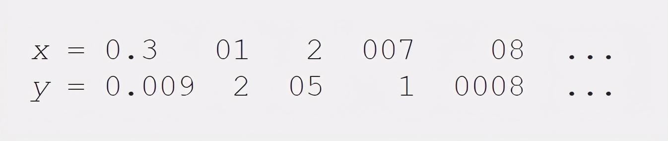 请注意,x和y的数字被分成了组,总是指向下一个非零数字。现在我们把数字z∈(0,1)与(x,y)联系起来,写下第一个x群组,然后是第一个y群组,然后是第二个x群组,以此类推。因此,在我们的例子中,我们得到: