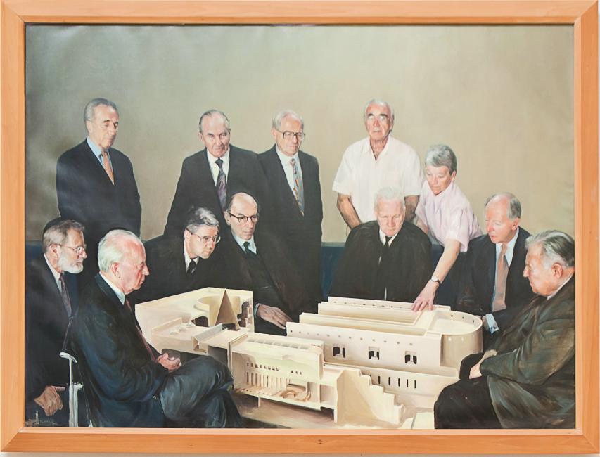 这幅画被挂在以色列最高法院的入口处,显示一群人在讨论最高法院的建筑方案,右二为雅各布.罗斯柴尔德,其他人都是德系犹太人的头面人物,不少成为以色列总统总理(资料来源:以色列最高法院官方网站)