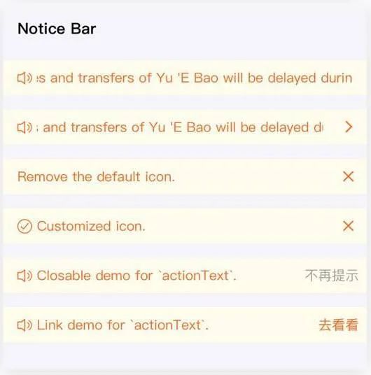 还是先来看定义。Alert是向用户展示需要关注的警告提示。Banner是用于标识全页的状态或通知。NoticeBar是在用于给用户显示提示消息。这三个组件其实是一回事,只是叫法不同而已,NoticeBar更多是移动端的一种叫法。这三个组件的基本样式如下。