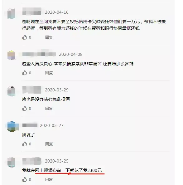 还有卡友表示,她当初找中介协商帮忙时,只是在网上视频咨询一下而已,就已经花了3300元。收费之贵,令人咋舌。