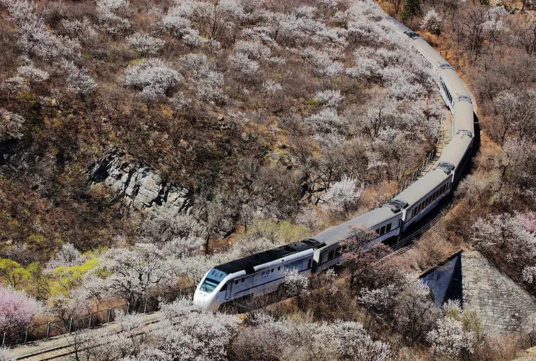 2019年4月2日,北京,昌平居庸关花海风景区,市郊S2线和谐列车穿行而过 / 千龙图像