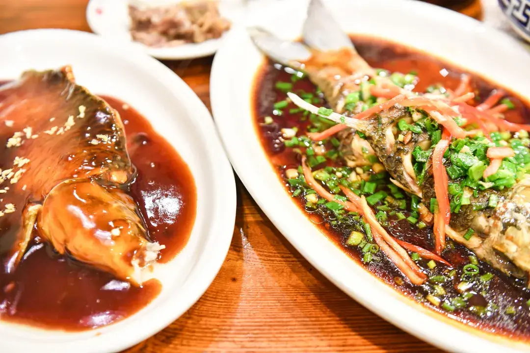 左为西湖醋鱼,右为清蒸河鱼,均为杭帮菜