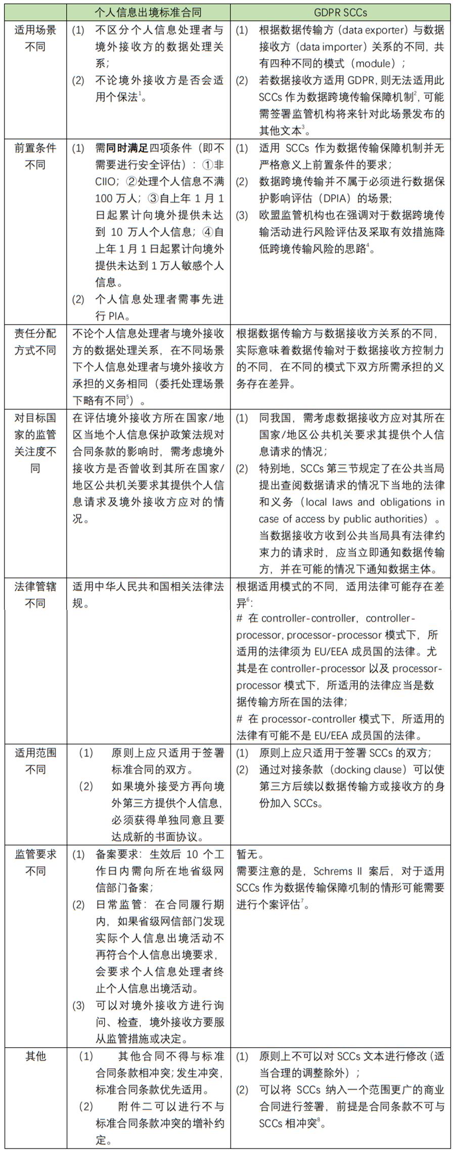 考虑到很多国际企业和在欧盟市场开展业务的中国公司多采用SCCs作为跨境传输机制以满足GDPR的要求,我们对比了中国版标准合同条款与GDPR SCCs的主要异同,以期为国内立法及企业实践提供借鉴和参考。