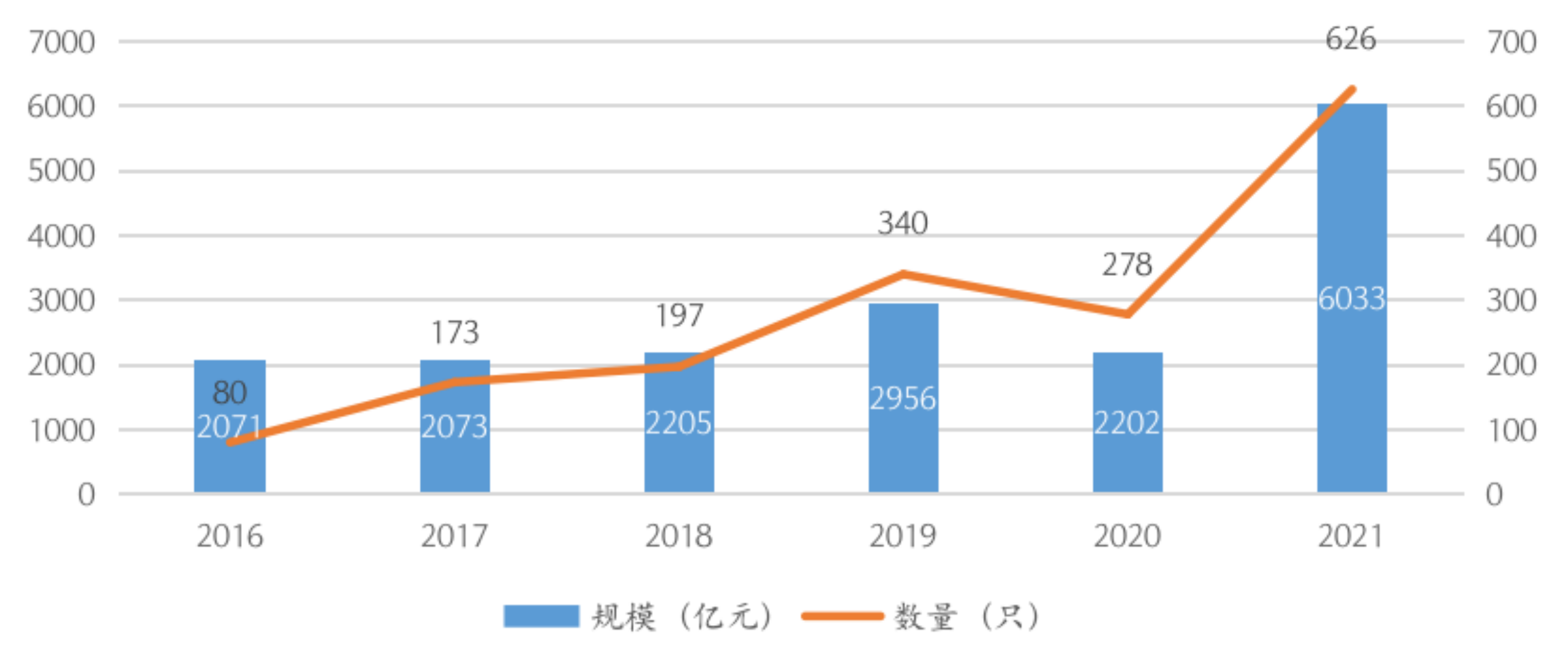 自2016年1月浦发银行发行首单绿色金融债以来,众多金融机构与企业积极参与到这个新兴市场中。此后,中国绿色债券市场蓬勃发展,每年发行额保持在2000亿元以上,2021年更取得巨大突破,全年共计发行626只,发行总金额超过6000亿元,余额达到了1.1万亿元,稳居全球前列。