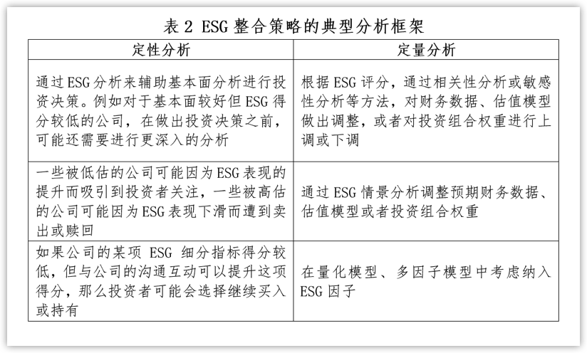 ESG整合是一种全面的投资分析方法,分别采用定性和定量方法,将ESG理念与传统财务信息等相融合,进行全面的项目评估,以形成投资决策,即在原有的投资策略中加入ESG因素。