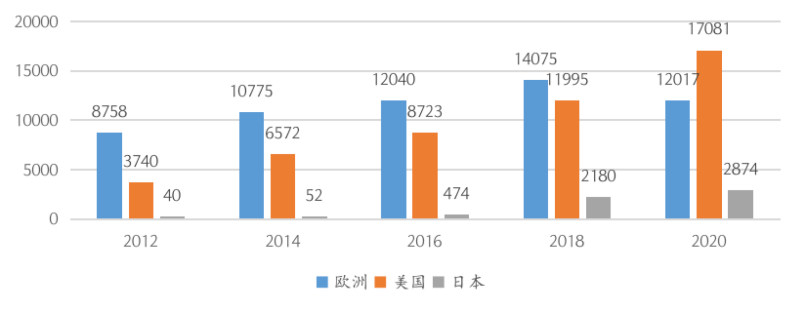 长期以来,欧洲地区一直是ESG投资的引领者和推动者,2012年欧洲市场ESG投资管理规模占比高达66%。但随着ESG理念在全球范围的不断推广,尤其随着美国ESG投资的蓬勃发展,其ESG投资规模在2020年超越欧洲成为第一,占比达到48%,欧洲ESG投资规模占比则逐步下降至34%,位列五个主要区域的第二名。另外,值得关注的是日本市场,其ESG投资规模在2014年后快速增加,2020年初已超越加拿大和大洋洲,位列第三名。