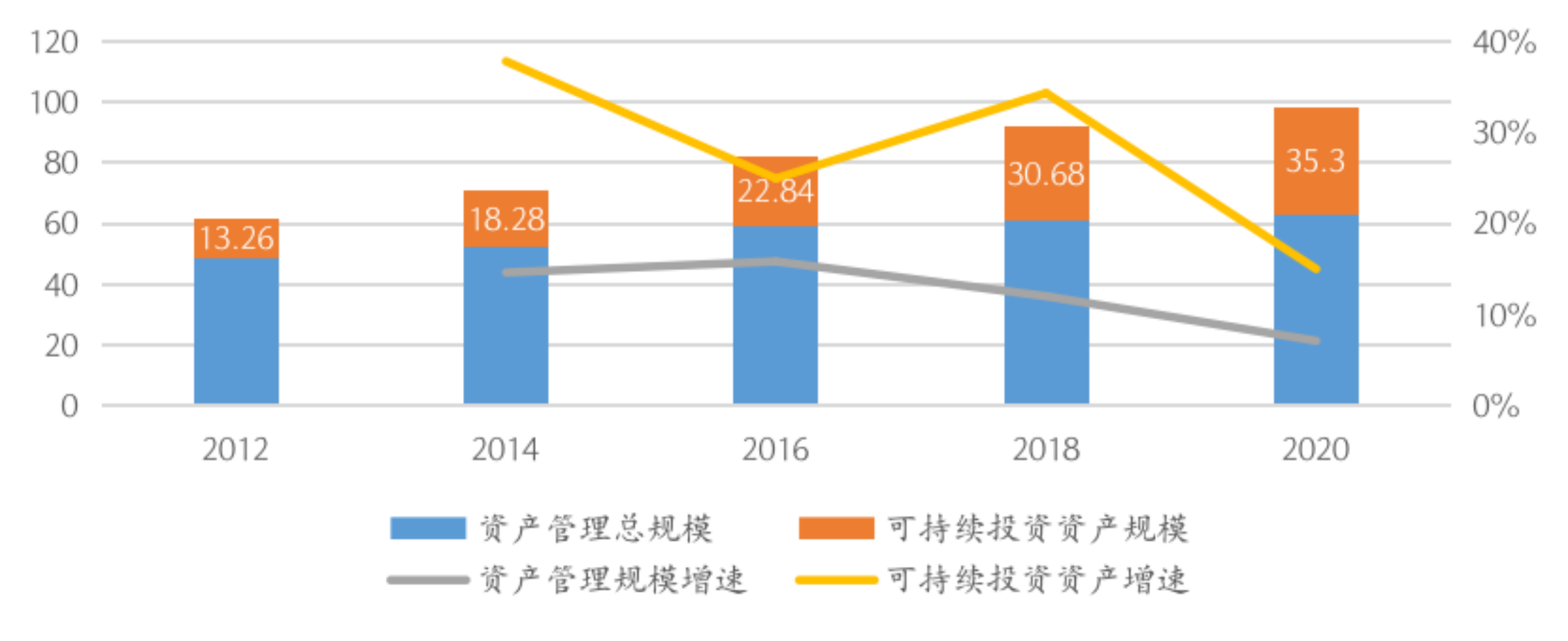 全球ESG投资的资产管理规模从2012年的13.20万亿美元增加至2020年的35.30万亿美元,年复合增速为13.02%,市场预计这一数据在2025年有望达50万亿美元