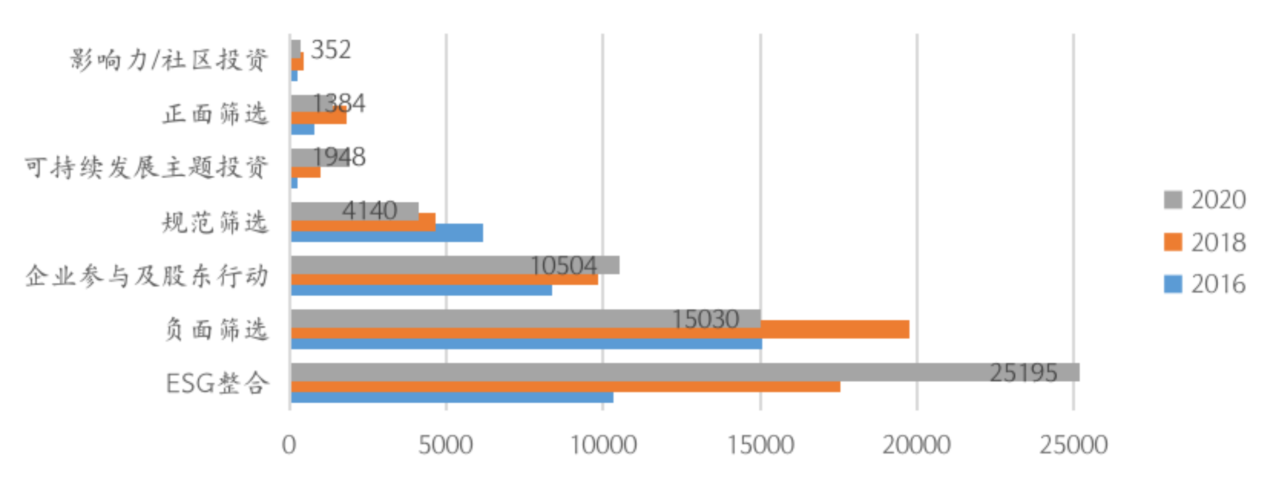 图8 各类ESG投资策略产品规模及趋势 数据来源:GSIA。单位:十亿美元