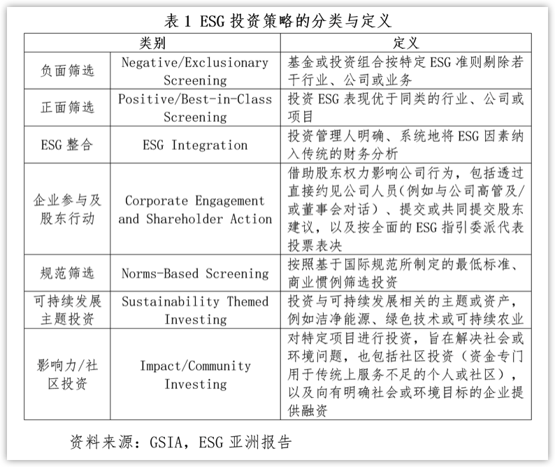 据GSIA对市场上投资机构ESG投资进行的统计分析,ESG投资策略主要分为七类:负面筛选、正面筛选、ESG整合、企业参与及股东行动、规范筛选、可持续发展主题投资和影响力/社区投资,这也是全球目前认可度最高的分类标准。