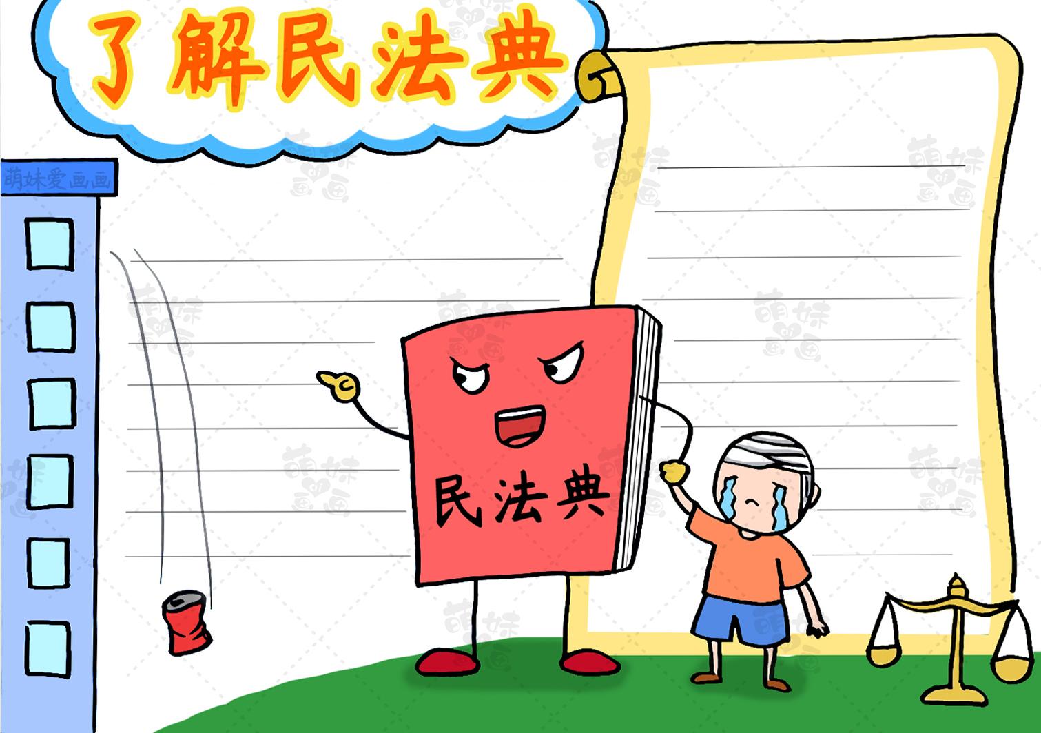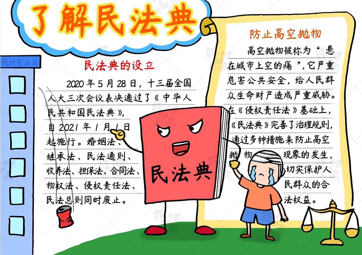 《中华人民共和国民法典》自2021年1月1日起施行,这是新中国第一部以法典命名的法律,被誉为社会生活的百科全书。今天和萌妹老师一起学画民法典手抄报,简单又漂亮,也适用于法制主题手抄报哦。