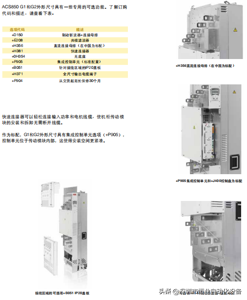 ACS850传动旨在内置到客户机柜,更大限度减小占用的机柜空间,同时确保柜体组装尽可能简单易行。ACS850采用高度模块化设计,支持多种不同的现场总线协议,并提供灵活的连接。除不同的输入输出和通信等各种内置选项外,ABB还提供不同类型的外部附件。ACS850传动的灵活性和可编程性使其适于不同行业的许多应用。
