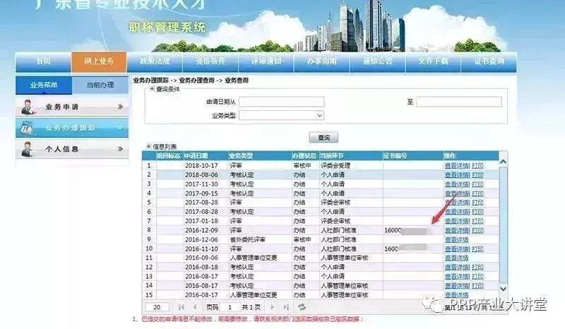 点击“网上业务”进入“业务办理跟踪”,打开“业务查询”,在“信息列表”中查看个人当年度的“证书编号”。