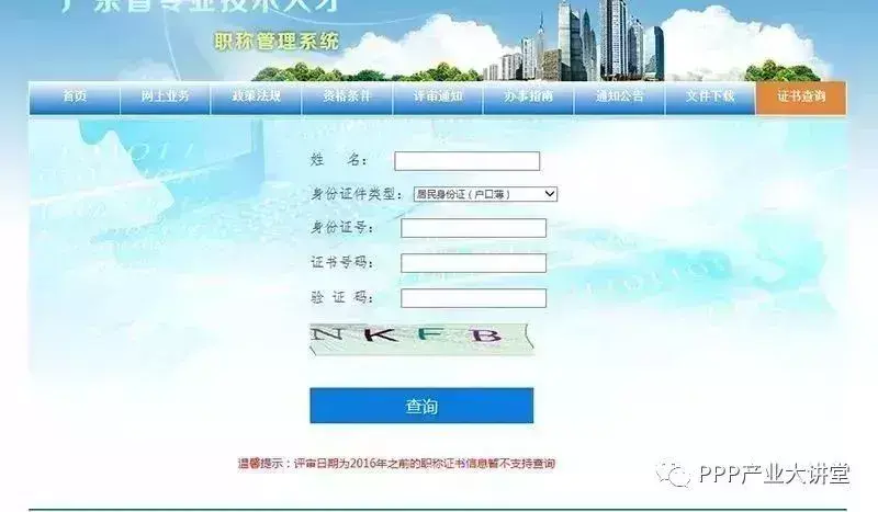 获取个人证书编号后,在广东省专业技术人才职称管理系统首页点击“证书查询”栏目,输入关键信息并点击“查询”按钮。