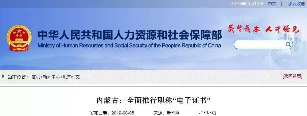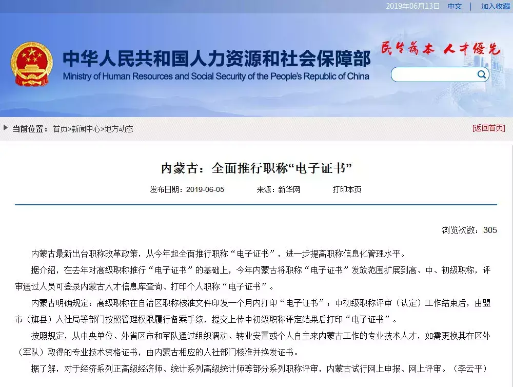 6月5号,人社部发出通知,内蒙古地区从今年起全面推行职称“电子证书”,进一步提高职称信息化管理水平。在去年对高级职称推行“电子证书”的基础上,今年内蒙古将职称“电子证书”发放范围扩展到高、中、初级职称,评审通过人员可登录内蒙古人才信息库查询、打印个人职称“电子证书”。