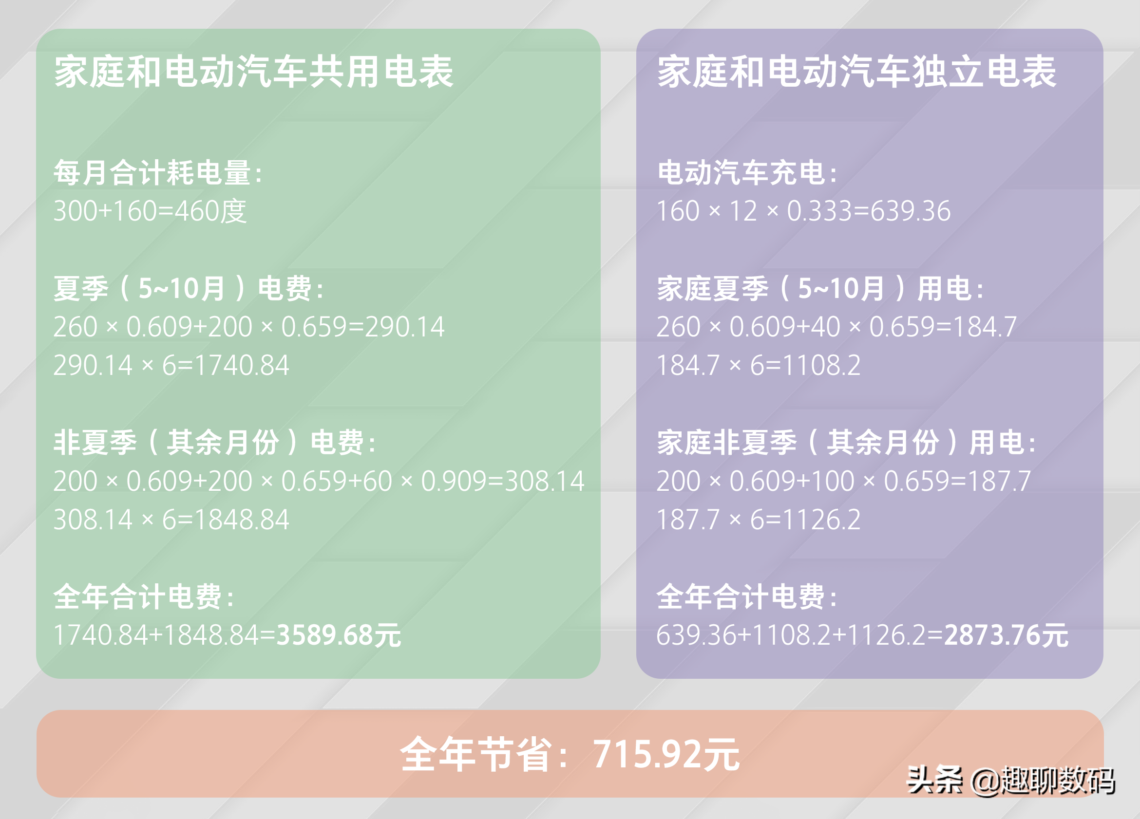 一年下来,单独给电动车开表可以省下700多块钱。这个数据也偏保守了,用电量越大的家庭越划算。