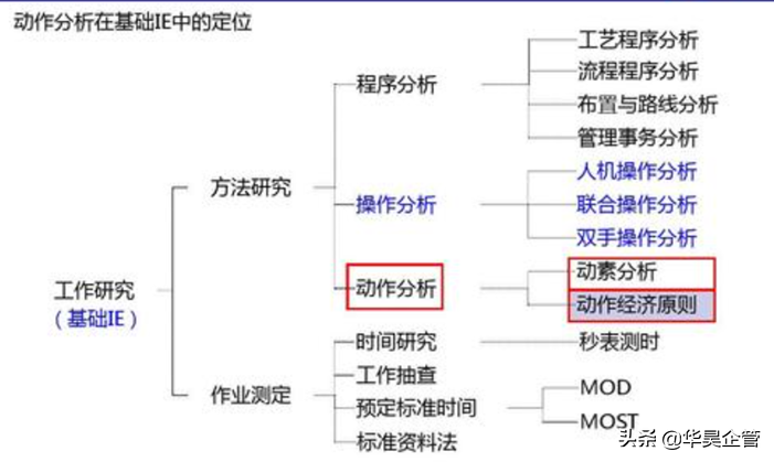 工业工程(IE,Industry Engineering), 是从科学管理的基础上发展起来的一门应用性工程技术。传统IE,通过时间研究与动作研究,工厂布置,物料搬运,生产计划和日程安排等,以提高劳动生产率;现代IE,以运筹学和系统工程作为理论基础,以计算机作为先进手段,兼容并蕴涵了诸多新学科和高新技术。动作分析与传统IE的关系如图所示。
