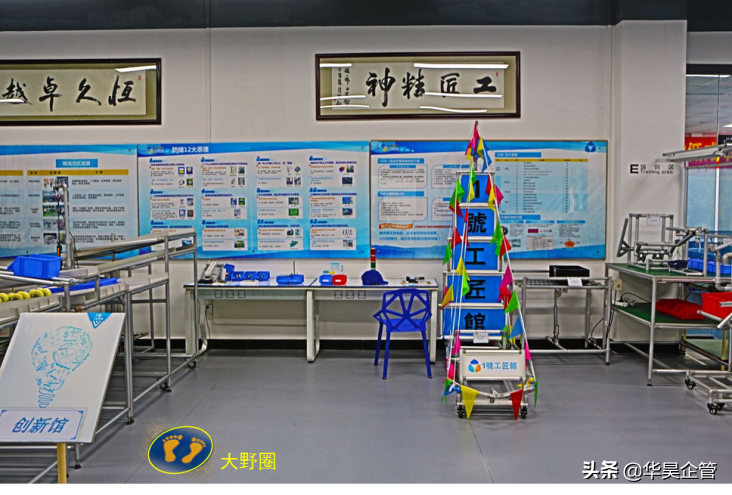 大野先生还有一个爱好,喜欢在西服兜里装几根粉笔。为培养管理人员和员工的观察力,大野耐一经常会在工厂的地上画一个圈圈,要求他们站在中间,用心观察生产活动的节拍,找出潜藏其中的浪费,这个圈圈就是「大野耐一圈」Ohno Circle。图为我们深圳 1号工匠馆里识别浪费的大野耐一圈。