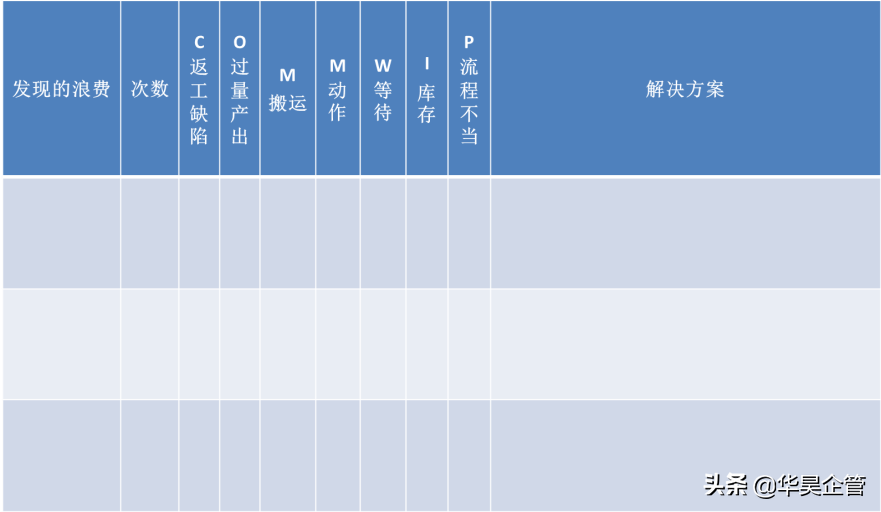 今天,站在大野耐一圈内,是我们培训和实践在现场识别浪费非常有效的方法。并把观察到的现象记录在如下的浪费识别表中。